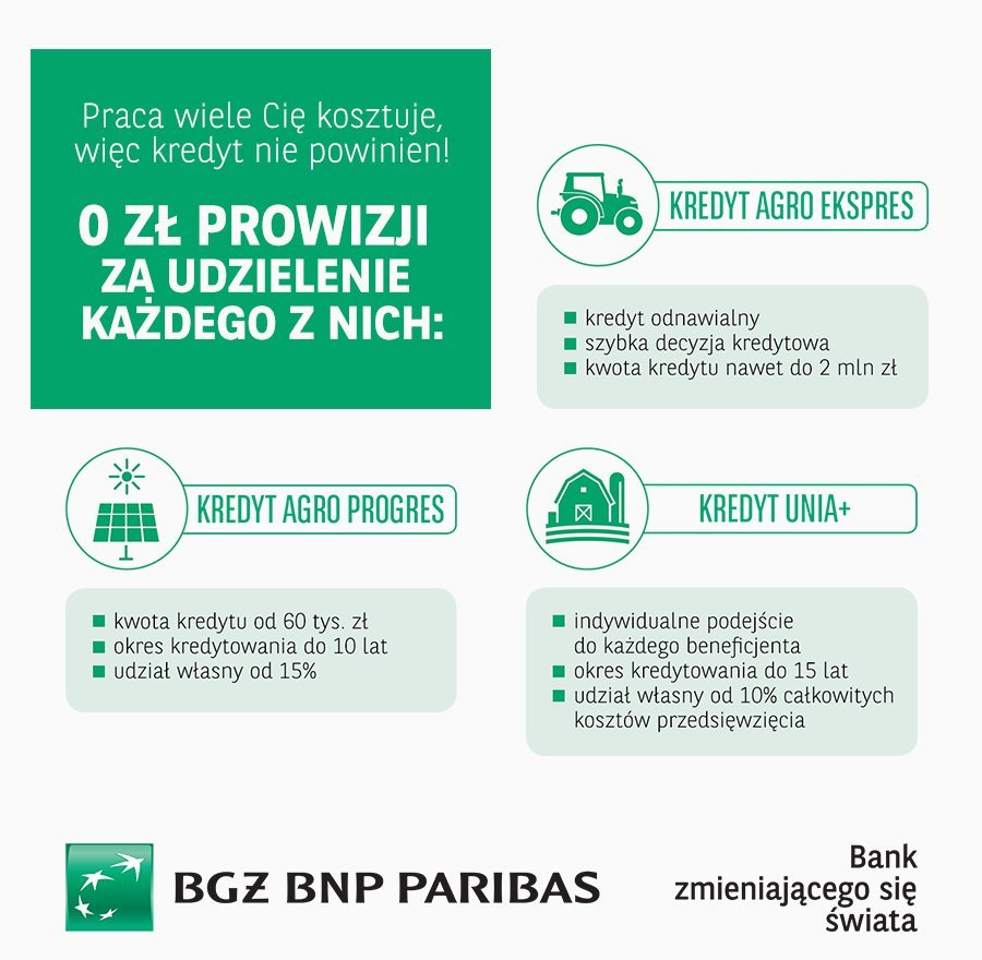 Materiał ma charakter reklamowy i informacyjny, nie stanowi oferty w rozumieniu art. 66 kodeksu cywilnego. Okres promocji obowiązuje od 15 stycznia do 31 maja 2019 r. Promocja skierowana jest do nowych i obecnych Klientów Banku z Segmentu Klientów Biznesowych (Mikroprzedsiębiorstw) prowadzących działalność wytwórczą w rolnictwie i ubiegających się o produkty objęte promocją. Podane warunki cenowe dotyczą nowo udzielanych kredytów Agro Ekspres, Agro Progres na fotowoltaikę i Unia+, a dla nowych Klientów również kredytów preferencyjnych z dopłatą do oprocentowania. Można wnioskować o przyznanie wybranego kredytu bądź wszystkich rodzajów kredytów równocześnie. Warunkiem skorzystania z promocji przez nowych Klientów jest otwarcie rachunku bieżącego w Pakiecie Agro Lider za 0 zł przez 12 m-cy od podpisania Umowy z kartą debetową, a przez obecnych – wystąpienie z wnioskiem o wydanie karty debetowej, jeżeli do tej pory nie została wydana. Dodatkowym warunkiem skorzystania z promocyjnego Kredytu Agro Ekspres jest przeniesienie wpływu z płatności bezpośrednich na rachunek w Banku BGŻ BNP Paribas. Zastosowanie podanych warunków cenowych możliwe jest tylko w przypadku złożenia prawidłowo wypełnionego i kompletnego wniosku kredytowego przez Klienta. Warunki cenowe dla promocyjnych produktów kredytowych obowiązują przez okres kredytowania od dnia podpisania umowy kredytu. Warunkiem skorzystania z niniejszej promocji jest posiadanie przez Klienta zdolności do spłaty kredytu we wnioskowanej kwocie oraz spełnienie warunków przyznania produktu. Świadczenie ochrony ubezpieczeniowej następuje na warunkach określonych w umowie zawartej z Klientem za pośrednictwem BGŻ BNP Paribas, działającego jako agent ubezpieczeniowy, przez Concordia Polska Towarzystwo Ubezpieczeń Wzajemnych z siedzibą w Poznaniu lub Towarzystwo Ubezpieczeń na Życie Cardif Polska S.A. z siedzibą w Warszawie oraz w Ogólnych Warunkach Ubezpieczeń. Świadczenie reklamowanych usług i produktów bankowych następuje na warunkach szczegółowo określonych w umowie zawartej z Klientem oraz w regulaminach i taryfie prowizji i opłat, dostępnych w oddziałach Banku oraz na stronie www.bgzbnpparibas.pl. Bank BGŻ BNP Paribas zajął 1. miejsce i uzyskał tytuł Bank Najlepszy dla Rolnika 2018 w rankingu przeprowadzonym (w marcu 2018 r.) przez eksperta badań rynku rolnego – firmę Martin & Jacob. Bank BGŻ BNP Paribas Spółka Akcyjna z siedzibą w Warszawie przy ul. Kasprzaka 10/16, 01-211 Warszawa, zarejestrowany w rejestrze przedsiębiorców Krajowego Rejestru Sądowego przez Sąd Rejonowy dla m.st. Warszawy w Warszawie, XII Wydział Gospodarczy Krajowego Rejestru Sądowego, pod nr. KRS 0000011571, posiadający NIP 526-10-08-546 oraz kapitał zakładowy w wysokości 147 418 918 zł, w całości wpłacony.