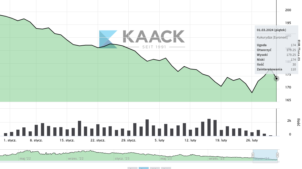 Na giełdzie w Paryżu kukurydza w poniedziałek ubiegłego tygodnia osiągnęła swój najniższy od ponad trzech lat poziom 168,50 EUR/t. Jednakże do końca lutego cena wzrosła o niemalże 10 euro za tonę. Mimo tego w piątek — 1 marca nastąpił kolejny spadek. W jego efekcie cena kukurydzy na paryskim rynku osiągnęła poziom 174 EUR/t. Taką stawkę ustaliła giełda dla kontraktów marcowych. Tymczasem kontrakty na czerwiec 2024 były jeszcze tańsze. Ściśle mówiąc, wyniosły 171,25 EUR/t.