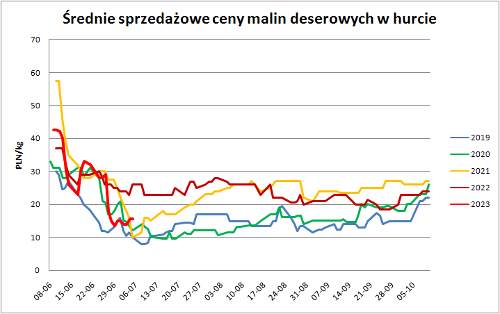 W ciągu zaledwie 10 dni ceny skupu malin deserowych spadły o prawie 60%, z 33,00 zł/kg do 13,50 zł/kg. W tym tygodniu jednak nastąpiła nieznaczna poprawa, o 15% (w stosunku do najniższych cen sprzed tygodnia). Ceny wynoszą średnio 15,50 zł/kg, kształtując się w zakresie od 11,0 zł/kg do 20,0 zł/kg.