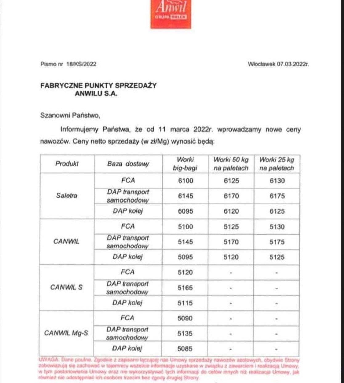 Dokładny cennik nawozów obowiązujący od 11 marca 2022 r. opublikowany przez spółkę Anwil przedstawia się następująco: