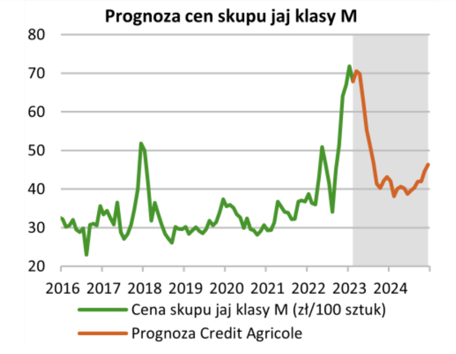 Analitycy Crédit Agricole prognozują, że cena skupu jaj klasy M na koniec 2023 r. wyniesie ok. 42 zł/100 sztuk oraz ok. 47 zł/100 sztuk na koniec 2024 r. Przyczynić się do tego mają redukcje kosztów energii oraz pasz. Być może także nadpodaż jaj napływających z Ukrainy. Głównymi czynnikami ryzyka dla powyższego scenariusza dotyczącego redukcji cen jaj będzie ostateczne kształtowanie się cen energii oraz pasz, a także przebieg ptasiej grypy w obecnym sezonie w Europie