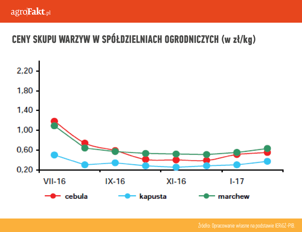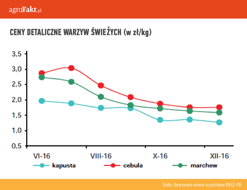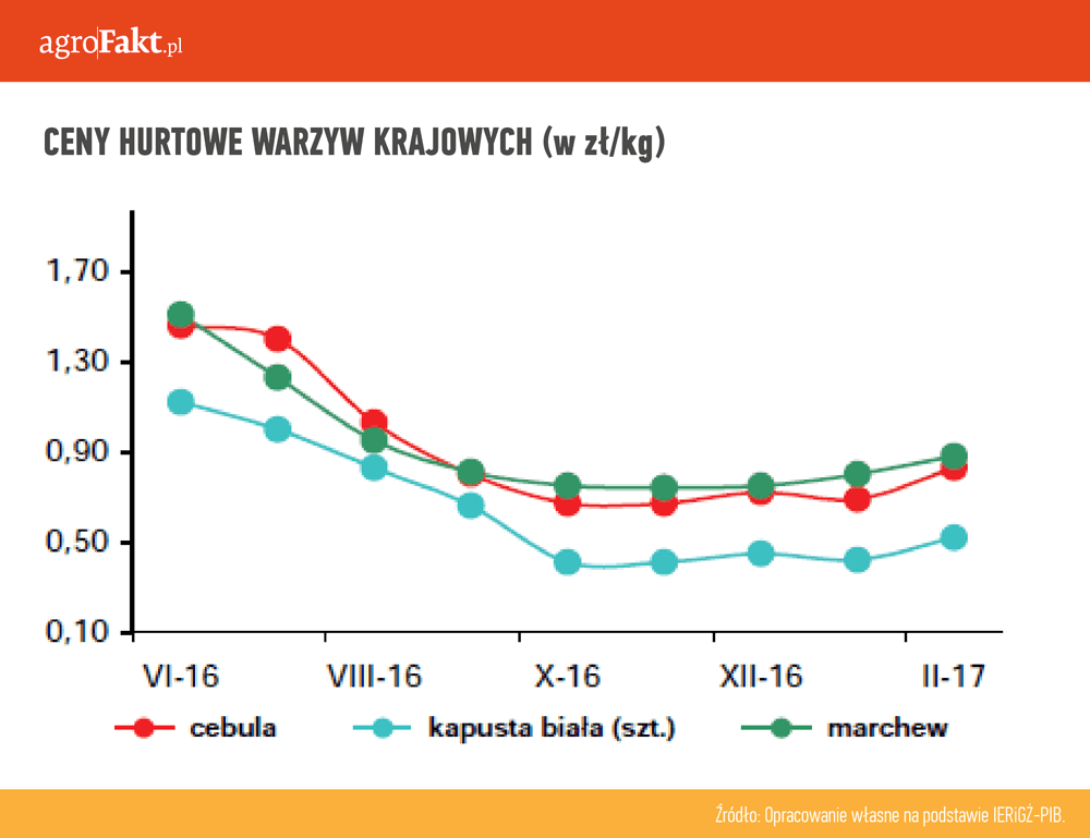 W pierwszych ośmiu miesiącach bieżącego sezonu (lipiec 2016 – luty 2017) średnie ceny warzyw spadły. Dla przykładu: średnia cena marchwi była o połowę niższa i wynosiła 0,63 zł/kg.