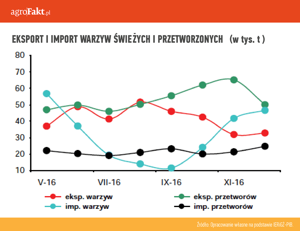 – Miniony rok 2016 był okresem wysokich zbiorów warzyw. Zbiory warzyw gruntowych zwiększyły się z 3,8 do 4,4 mln t. Z kolei produkcja warzyw spod osłon zwiększyła się z 1 do 1,02 mln t. W dodatku wzrostowi w Polsce towarzyszył spadek zbiorów w całej Unii Europejskiej – analizuje dr Olejniczak z Alior Bank. – Wysokie zbiory warzyw powinny skutkować wzrostem produkcji przetworów, w tym mrożonek. W efekcie oczekuje się zwiększenia wolumenu eksportu mrożonek. Według szacunków IERiGŻ-PIB w 2017 r. spodziewany jest wzrost również wolumenu eksportu warzyw świeżych – dodaje.