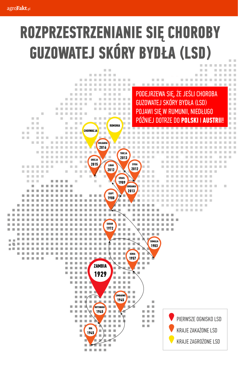 lek. wet. Paweł Niemczuk, Główny Inspektorat Weterynarii: Pierwsze ognisko LSD w Unii Europejskiej stwierdzono na terytorium Grecji w sierpniu 2015 r. Choroba wystąpiła niedaleko granicy z Turcją, gdzie już wcześniej były stwierdzane przypadki tej choroby. W związku z powyższym, uważa się, że choroba zastała zawleczona do Grecji właśnie z terytorium tego kraju. W 2016 r. choroba w UE wystąpiła na terytorium Grecji oraz Bułgarii. Ponadto, w 2016 r. choroba została stwierdzona w położonych w Europie państwach trzecich, takich jak: Albania, Macedonia, Kosowo, Serbia i Czarnogóra.