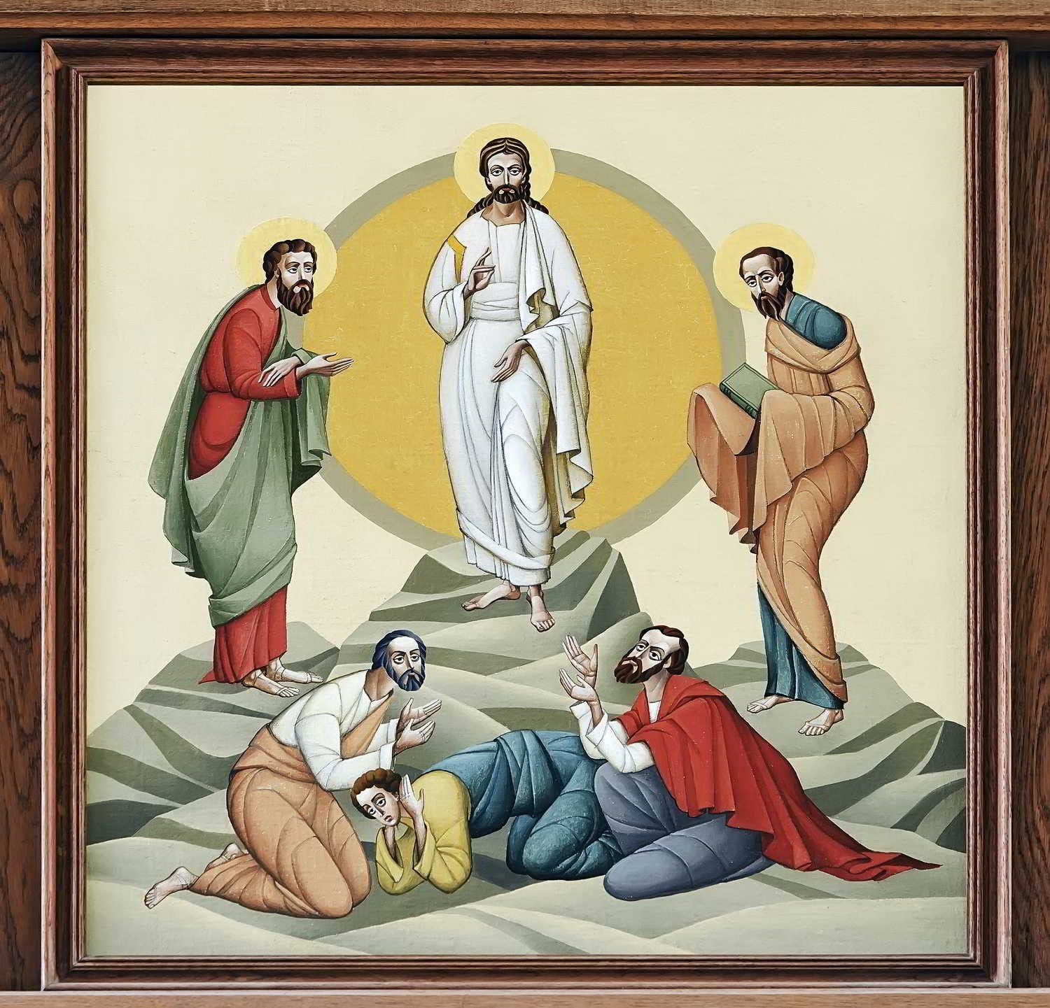 Jezus wszedł na górę, na której zaczął się modlić. Zstąpiła na niego wielka światłość. Jezus stanął tam w obłoku tak, że uczniowie mogli go zobaczyć w nieziemskiej chwale, rozmawiającego z Eliaszem i Mojżeszem.