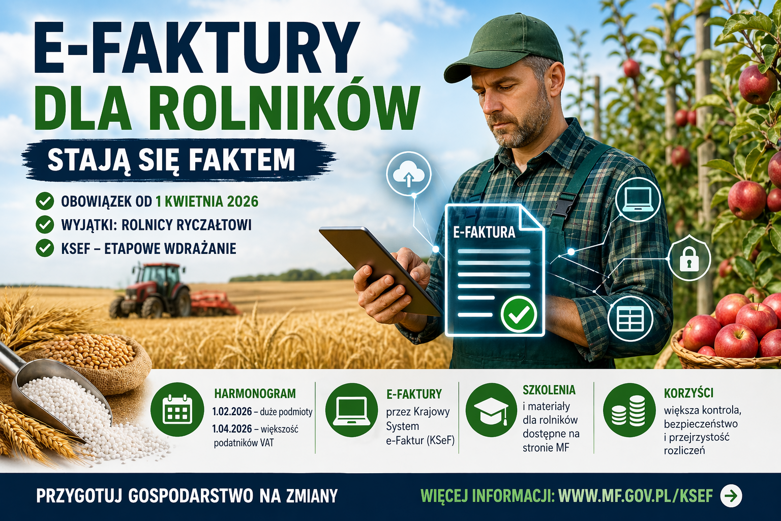 E-faktury dla rolników stają się faktem, mimo sprzeciwu samorządu rolniczego. Krajowa Rada Izb Rolniczych już 30 grudnia apelowała o wyłączenie rolników z obowiązkowego systemu, jednak Ministerstwo Finansów odpowiedziało dopiero 14 kwietnia i odrzuciło ten postulat. Oznacza to, że gospodarstwa muszą przygotować się na nowe obowiązki, choć nie wszystkich rolników obejmują one w tym samym czasie i zakresie.