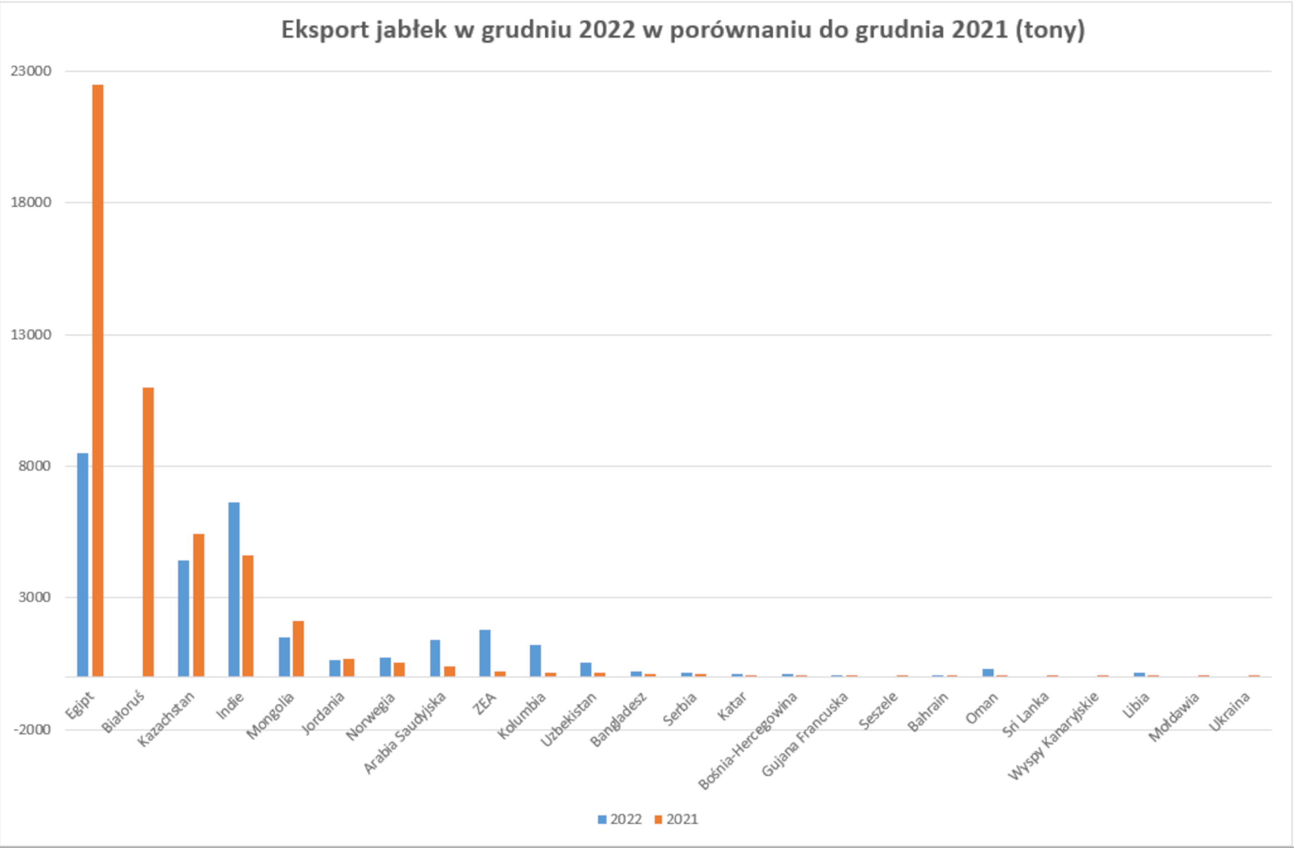 Eksport jabłek w grudniu 2022, podobnie jak w październiku i listopadzie, był niższy niż w analogicznym okresie roku 2021. Mianowicie spadek ten wyniósł ponad 18 885 ton.