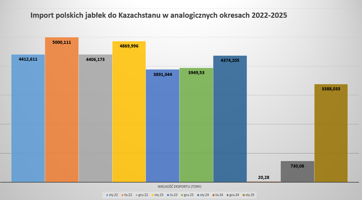Ostatecznie, tak jak deklarował w październiku 2024 r. Alim Kirabayev, ambasador Kazachstanu w Polsce, ograniczenia w imporcie polskich jabłek rzeczywiście zakończyły się w 2024 r. Jednakże po kilkumiesięcznej przerwie Kazachowie nie kupili już u nas w styczniu tyle jabłek, jak zamawiali przez kilka lat wcześniej.