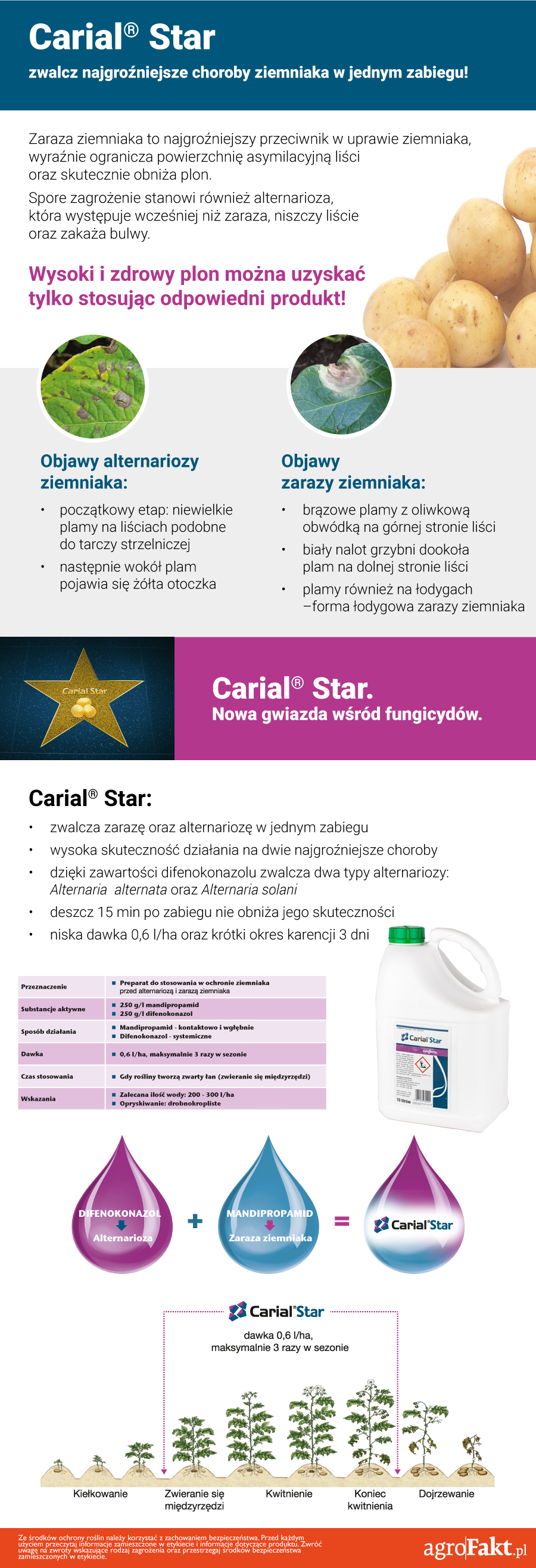 Odpowiednio skomponowane środki ochrony roślin nie tylko chronią uprawę przed zniszczeniami, ale też są łatwe w stosowaniu. Produkt Carial® Star to wysoka skuteczność działania na dwie najgroźniejsze choroby ziemniaka, dzięki zawartości dwóch uzupełniających się substancji czynnych. Na poniższej infografice, znajdziesz informacje dotyczące odpowiedniego terminu stosowania preparatu, optymalnej dawki, a także więcej korzyści z jego użycia.