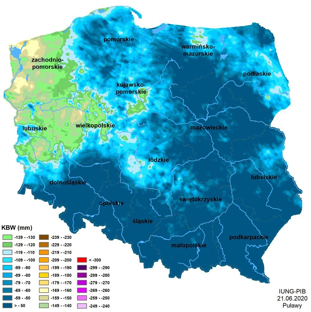 Jak wynika z czwartego raportu IUNG średnia wartość KBW (Klimatyczny Bilans Wodny to miernik w oparciu, o który określa się stan zagrożenia suszą) w okresie od 21 kwietnia do 20 czerwca br. była minimalnie ujemna, -1 mm.