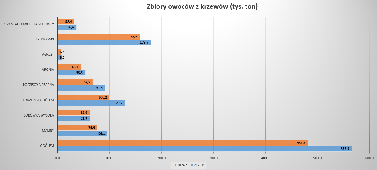 Łącznie, wielkość produkcji owoców jagodowych wszystkich ważnych gospodarczo gatunków krzewów owocowych GUS wyliczył w 2024 r. na 481,7 tys. ton. Jest to aż o 14,9% mniej niż w roku poprzednim, kiedy to łączna produkcja wyniosła 565,9 tys. ton owoców z krzewów.