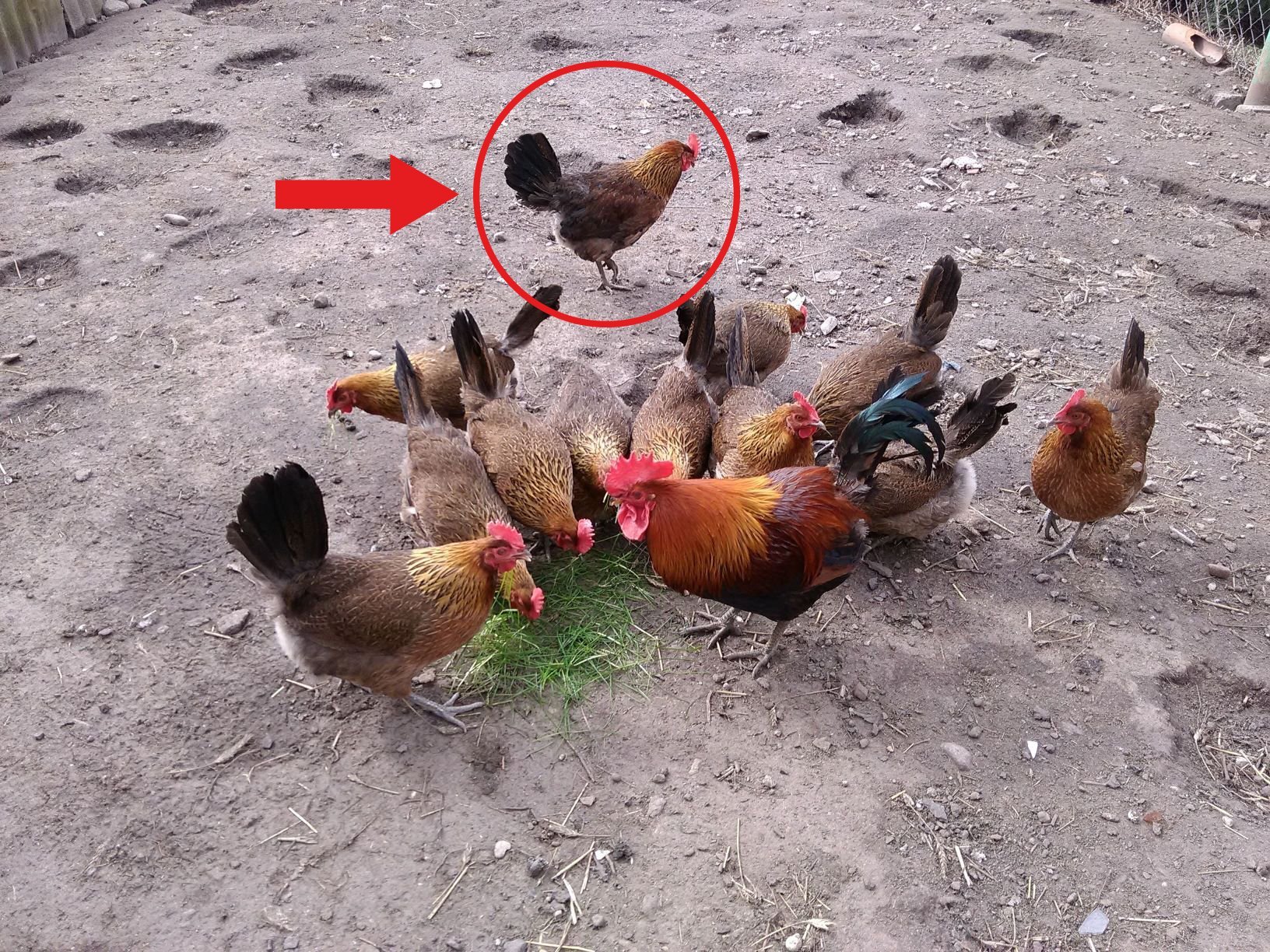 Stadko kur zielononóżek kuropatwianych z kogutem-samcem alfa oraz z kogutem, który fenotypowo upodobnił się do samic. Na pierwszy rzut oka ciężko odróżnić go od pozostałych kokoszek