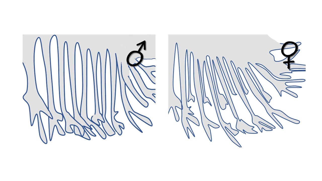 Schematyczne przedstawienie wzrostu lotek skrzydełek u jednodniowych kurcząt – z lewej samiec, z prawej samica