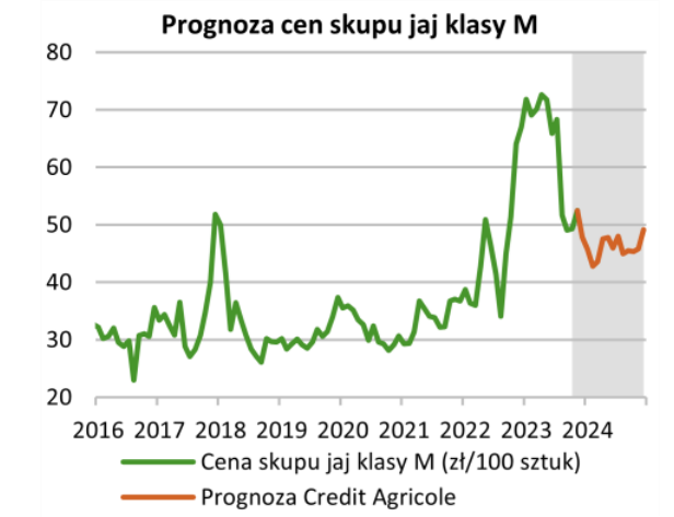 W rok 2024 weszliśmy z ceną jajek na poziomie najwyższych wartości z lat 2016–2022. Jednakże analitycy spodziewali się, że będą one sukcesywnie malały. Za wyraźny trend spadkowy miały odpowiadać nadpodaż, związana z wysoką opłacalnością produkcji jaj w 2023 r. Poza tym cena jajek w dużej mierze zależy do ceny pasz, a te maleją.