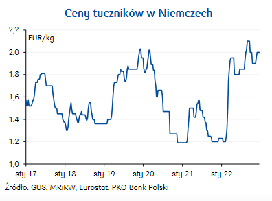 Oczekujemy, że przeciętna cena skupu trzody chlewnej w 2023 wzrośnie w stosunku do 2022 o 2-11%, choć już 2h23 może przynieść spadki w relacji rocznej o 4-15%. Niewykluczony spadek cen pasz może złagodzić presję kosztową w produkcji żywca, jednak silne podwyżki cen nośników energii i duża niepewność na rynku powstrzymają ewentualne duże zmiany w podaży co najmniej do końca 1q23.