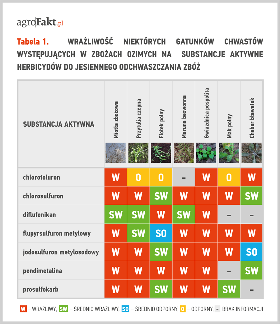 Kolejna substancja – diflufenikan dobrze sprawdza się na polach zachwaszczonych fiołkiem polnym, jednak w średnim stopniu niszczy miotłę zbożową. Do tego posiada dość wąskie spektrum zwalczanych gatunków dwuliściennych. W związku z tym, na polach z bogatszym składem gatunkowym, korzystniej jest zastosować jego fabryczne mieszaniny. Większość jednoskładnikowych herbicydów z diflufenikanem stosuje się we wczesnych fazach rozwojowych zbóż, tak więc nie nadaje się on do późno jesiennych zabiegów. Dla odmiany chlorotoluron jest substancją, którą można stosować dość długo – do końca krzewienia bądź wystąpienia przymrozków. Niszczy on chwasty nawet w temperaturze 0°C. W późniejszych fazach rozwojowych (krzewienie) można również użyć flupyrsulfuron metylowy oraz mieszaniny: pendimetalina + pikolinafen, diflufenikan + chlorosulfuron, diflufenikan + mezosulfuron metylowy + jodosulfuron metylosodowy. Należy pamiętać, aby wybrany herbicyd dostosowany był do gatunków chwastów występujących na polu. W tabeli 1. przedstawiono wrażliwość niektórych gatunków chwastów na substancje aktywne herbicydów.