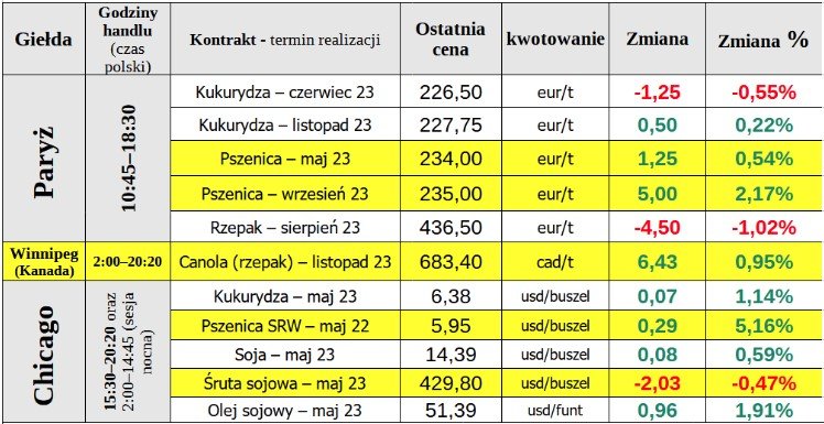 Analogicznie do notowań w USA, również MATIF odnotował wzrost cen pszenicy z tegorocznych zbiorów (ponad 2%). Jednak kontrakty na pozostałe zboża i rzepak uległy presji drożejącego kursu euro. Tym sposobem potaniały czerwcowe kontrakty na kukurydzę (–0,55%) oraz sierpniowe na rzepak (–1,02%)