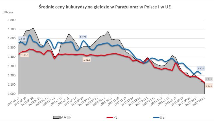 Jeżeli chodzi o średnią cenę kukurydzy suchej, to wyniosła ona 1121 zł/t (–2,9%). Co więcej, w krajowym skupie w porównaniu z najbliższymi sesjami przewyższała ona notowania giełdy paryskiej. Jednak w wobec średniej ceny UE była ona niższa.