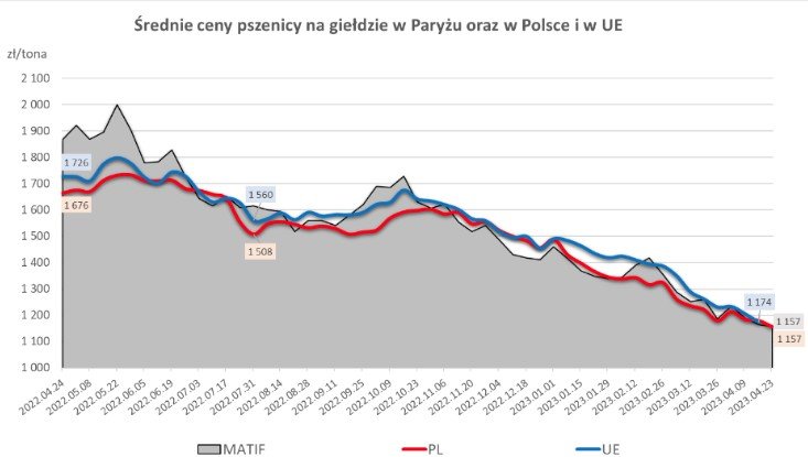 Jak czytamy w raporcie MRiRW za okres 17–23.04.2023 r., cena pszenicy konsumpcyjnej wyniosła 1157 zł/t (–2% w skali tygodnia). Z kolei cena pszenicy paszowej ukształtowała się na poziomie 1161 zł/t (+10%). A zatem średnie ceny pszenicy były w połowie kwietnia zbliżone do tych notowanych na MATIFIE. Nie odstawały również od średniej unijnej.