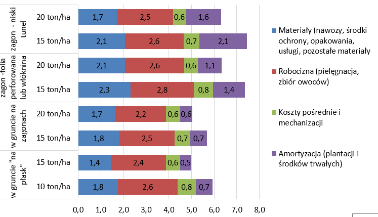 Jeszcze wyższe koszty (od 101 do 118 tys. zł/ha) truskawek uprawianych na zagonach w gruncie, ale okrywanych folią perforowaną (włókniną) lub pod niskimi tunelami były skutkiem dodatkowych kosztów amortyzacji tych osłon oraz krótszego okresu amortyzacji plantacji (2 lata).
