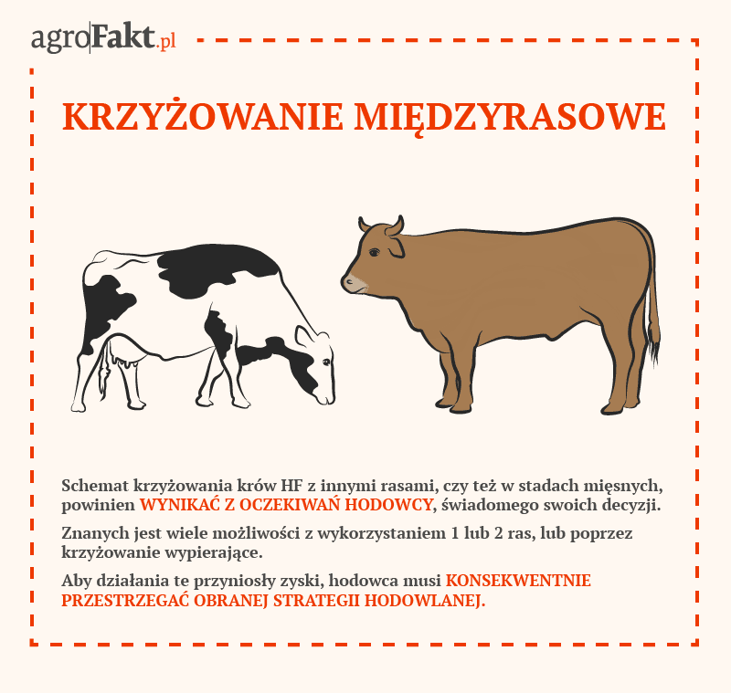 Na koniec należy jednak podkreślić, że schemat krzyżowania krów HF z innymi rasami, czy też w stadach mięsnych, powinien wynikać z oczekiwań hodowcy, świadomego swoich decyzji. Znanych jest wiele możliwości z wykorzystaniem 1 lub 2 ras, lub poprzez krzyżowanie wypierające. Aby działania te przyniosły zyski, hodowca musi konsekwentnie przestrzegać obranej strategii hodowlanej. Nie bójmy się skorzystać z porady fachowców!