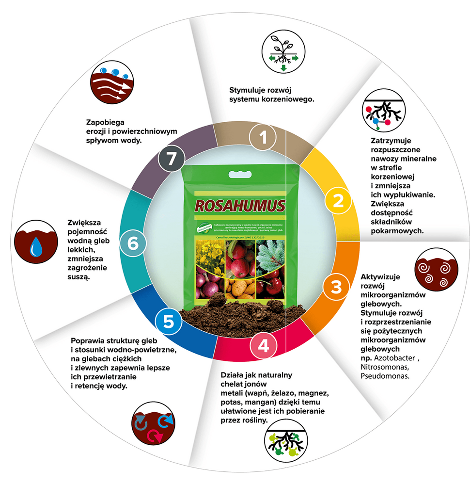 - Oprócz tego nawóz Rosahumus aktywizuje rozwój mikroorganizmów glebowych.
