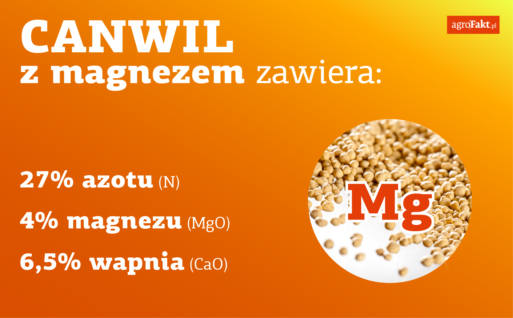 CANWIL z magnezem zawiera 27% azotu (N), 4% magnezu (MgO) i około 6,5% wapnia (CaO). Jest to nawóz granulowany, o wysokiej trwałości jasnobrązowych granul, która zabezpiecza nawóz przed zbrylaniem się, jednocześnie umożliwiając jego szeroki rozrzut siewnikami nawozowymi. Nawóz jest łatwo rozpuszczalny w wodzie. To ułatwia jego przenikanie do roztworu glebowego i dostępność dla roślin. Zawiera azot w dwóch formach (po 50%) – szybko działającej azotanowej (NO3–) i wolniej działającej amonowej (NH4+).