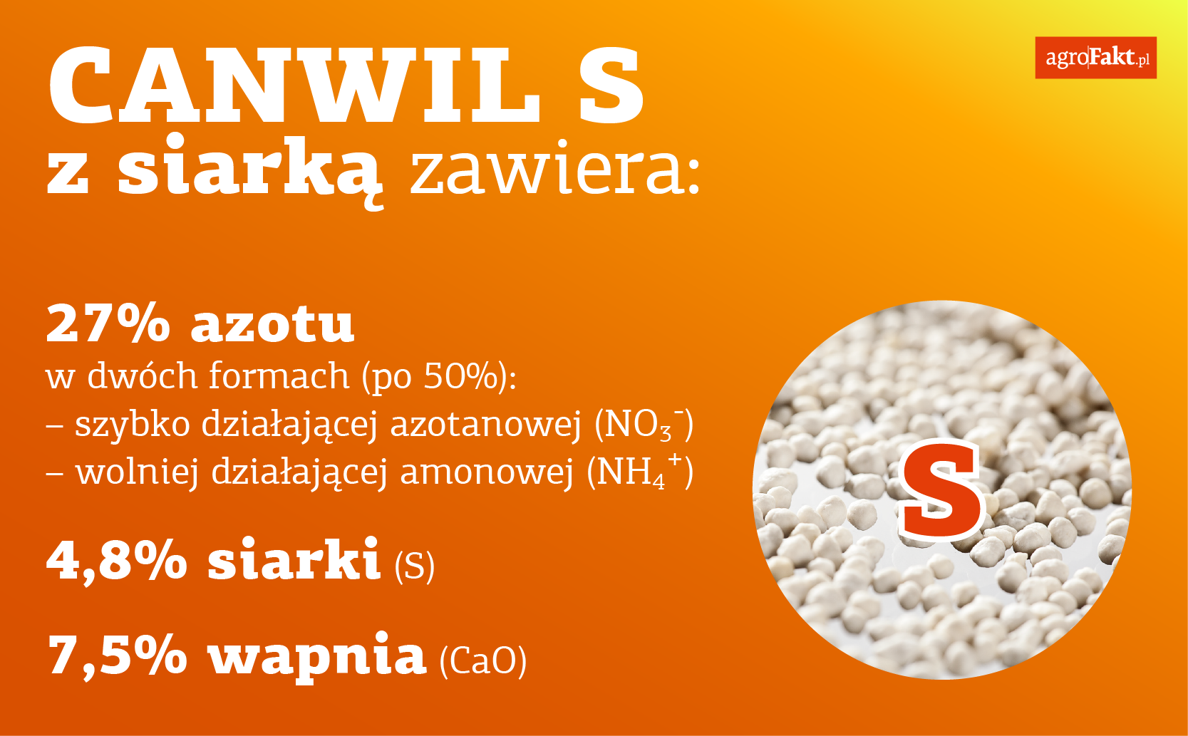 CANWIL S z siarką zawiera 27% azotu dwóch formach (po 50%) – szybko działającej azotanowej (NO3–) i wolniej działającej amonowej (NH4+). W jego składzie jest ponadto 4,8% siarki (S) i około 7,5% wapnia (CaO). Właściwości fizyczne nawozu są identyczne jak CANWILU z magnezem, poza tym, że barwa granul jest jasnoszara. Nawóz jest zalecany do stosowania w przypadku tych gatunków roślin, które wymagają do swojego rozwoju siarki. Gleby w Polsce są mało zasobne w siarkę, dlatego jej wprowadzenie do roztworu glebowego jest bardzo ważne.
