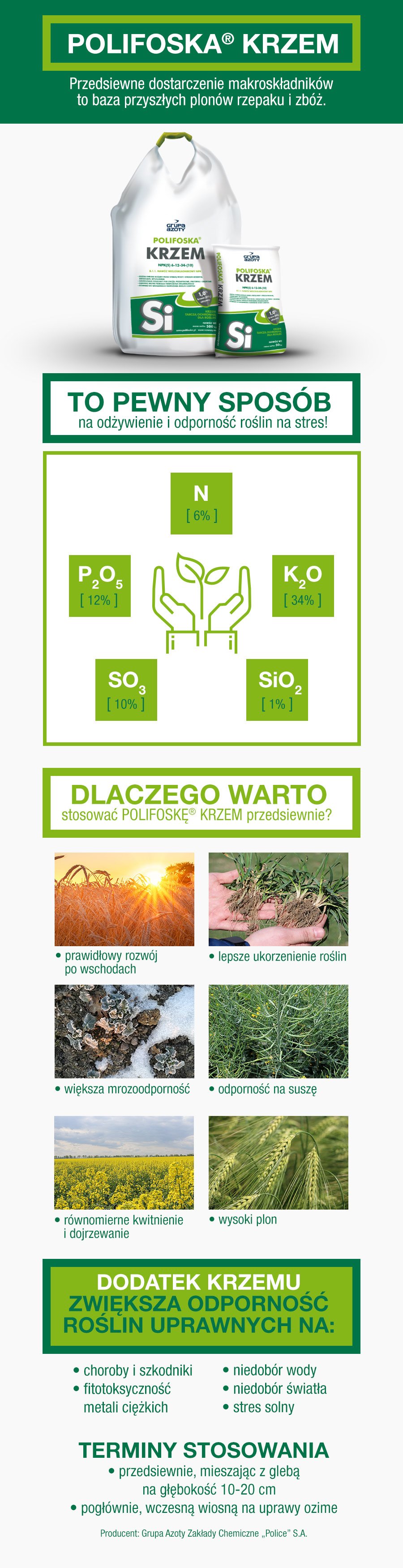 Pewny sposób na odżywienie i odporność roślin na stres gwarantuje POLIFOSKA® KRZEM. Przedsiewne stosowanie nawozu to m.in. lepsze ukorzenienie roślin, równomierne kwitnienie i dojrzewanie, a także wysoki plon. Dowiedz się więcej z naszej infografiki!