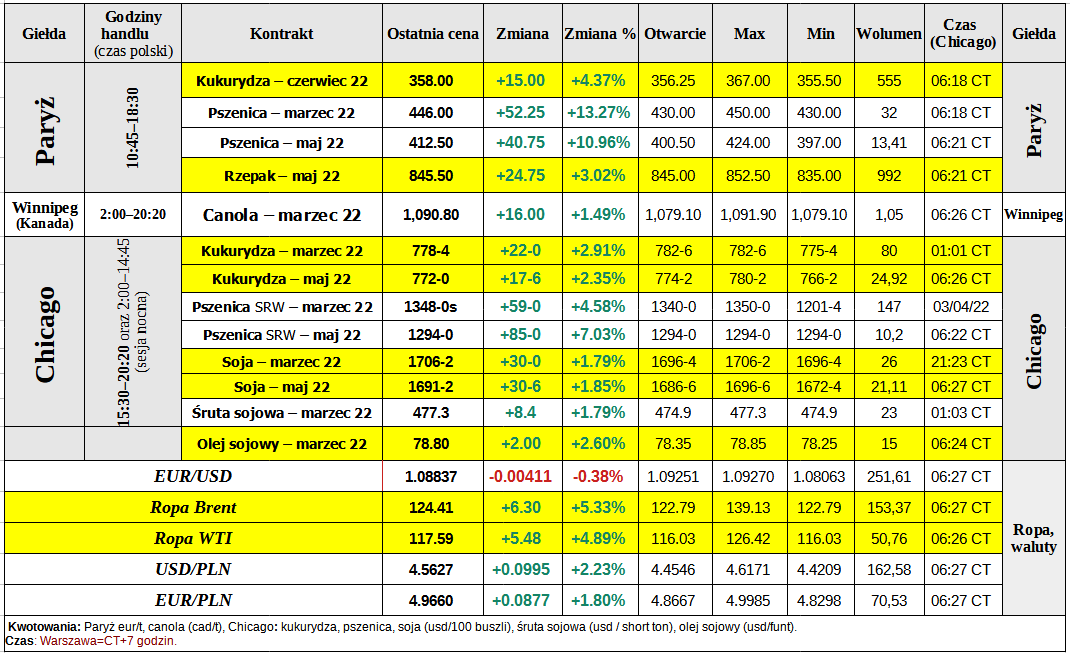 Szczegółowe notowania cen zbóż na giełdach w dniu 7 marca 2022 r. z godz. 13.00 przedstawia poniższa tabela: