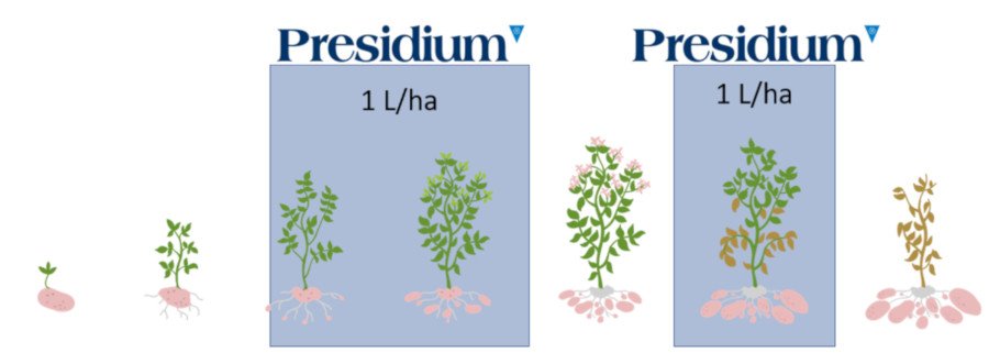 Idealnym rozwiązaniem w walce z zarazą ziemniaka jest produkt Presidium, który posiada w swoim składzie dwie substancje czynne, należące do różnych grup chemicznych: dimetomorf (pochodne kwasu cynamonowego, FRAC H5) oraz zoksamid (benzamidy, FRAC B3). Pierwsza z nich wykazuje działanie wgłębne. Jej mechanizm polega na blokowaniu syntezy celulozy w ścianach komórkowych zarodników i strzępek Phytophthory infestans. Natomiast druga powierzchniowa blokuje podział komórek patogenu, które powiększają się, a następnie zamierają. Obie substancje wykazują działanie antysporulacyjne, a więc hamujące zarodnikowanie. Zoksamid silnie wiąże się z woskiem roślinnym, zwiększając odporność produktu za zmywanie. Presidium charakteryzuje działanie zapobiegawcze oraz lecznicze, ale należy stosować go przed tym, jak wystąpią objawy zarazy ziemniaka, w dawce 1 l/ha. Idealnie sprawdza się w okresie zwierania międzyrzędzi oraz po kwitnieniu.
