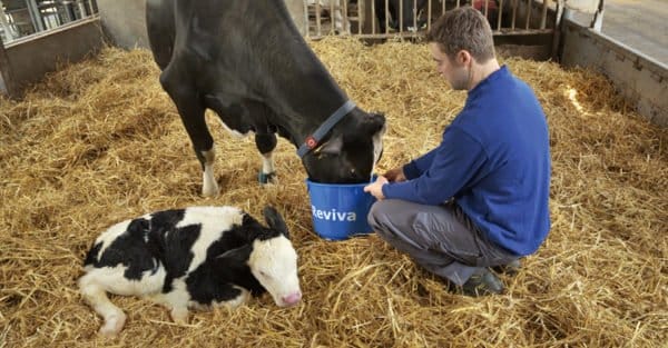 - Powinno się zapobiegać trudnościom w mobilizacji właściwych ilości wapnia, które często prowadzą do gorączki mlecznej, a w konsekwencji także do innych typowych dla tego okresu schorzeń – odpowiednio dobrane pójło może tu mieć kluczowe znaczenie.Należy ponadto wspomnieć o towarzyszącym wycieleniu stresie, który – jak wiadomo – wpływa ujemnie na dobrostan bydła mlecznego. Bez wątpienia natomiast wzmaga wszelkiego rodzaju stany chorobowe. Ogólne informacje o Farm-O-San Reviva, źródło: Trouw Nutrition Polska W jaki sposób można istotnie zminimalizować zagrożenia okresu okołowycieleniowego oraz wspomóc efektywny start krowy w laktację?W celu zadbania o dobrostan bydła mlecznego, bezpośrednio po wycieleniu zalecamy podawać pomarańczowe pójło energetyczne Farm-O-San Reviva. Opakowanie pójła Farm-O-San reviva, fot. Trouw Nutrition Polska Farm-O-San Reviva zawiera łatwo przyswajalne źródło energii, dzięki czemu błyskawicznie uzupełnia jej niedobory, wpływając korzystnie na dobrostan bydła mlecznego. Pójło poporodowe Farm-O-San Reviva dostarcza niezbędnych elektrolitów, sprzyjających szybkiemu nawodnieniu oraz wnosi zestaw witamin i minerałów wspierających odporność. Farm-O-San Reviva to bogate źródło wapnia, w ilości wystarczającej w pierwszym dniu po wycieleniu, co daje krowie czas niezbędny na jego wyprodukowanie tak z rezerw własnego ciała, jak i z pobieranych pasz. Prawie 100% krów wypija pójło poporodowe Farm-O-San Reviva spontanicznie, co w konsekwencji pozwala uniknąć powszechnych dolegliwości okresu powycieleniowego, a dzięki temu istotnie poprawić dobrostan bydła mlecznego w stadzie. Udział procentowy krów pobierających pójło energetyczne Farm-O-San reviva, źródło: Trouw Nutrition Polska Artykuł pochodzi z czasopisma „Trouw i My” firmy Trouw Nutrition Polska.