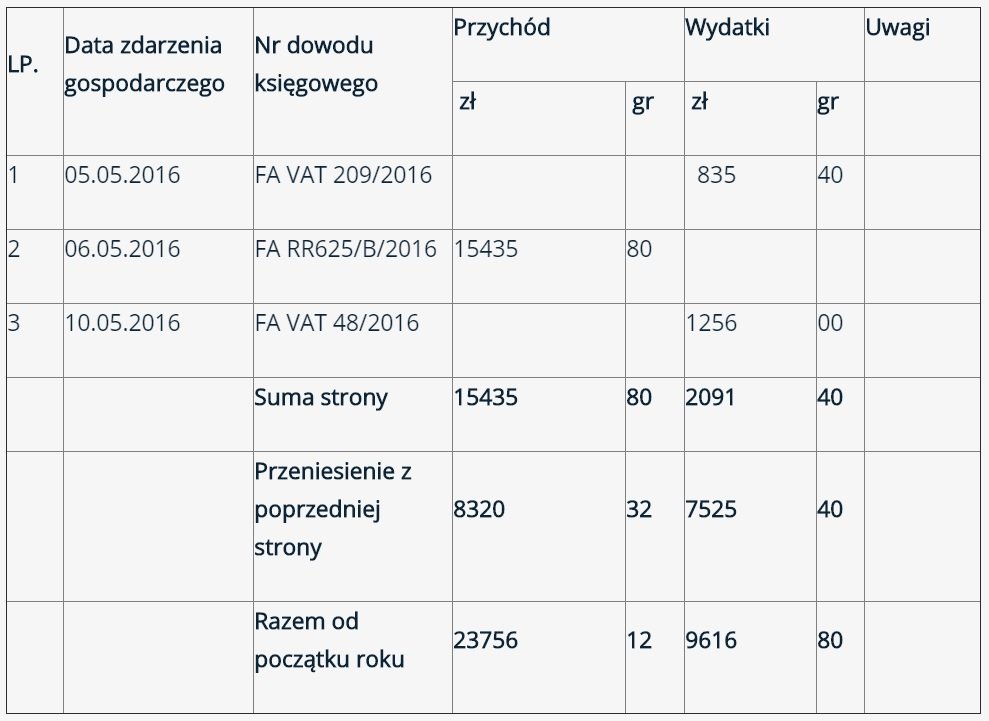- wpisy zostaną przedstawione na podstawie dowodów wpłat jak np: faktury VAT RR, rachunki, dowody opłat pocztowych i bankowych itp.