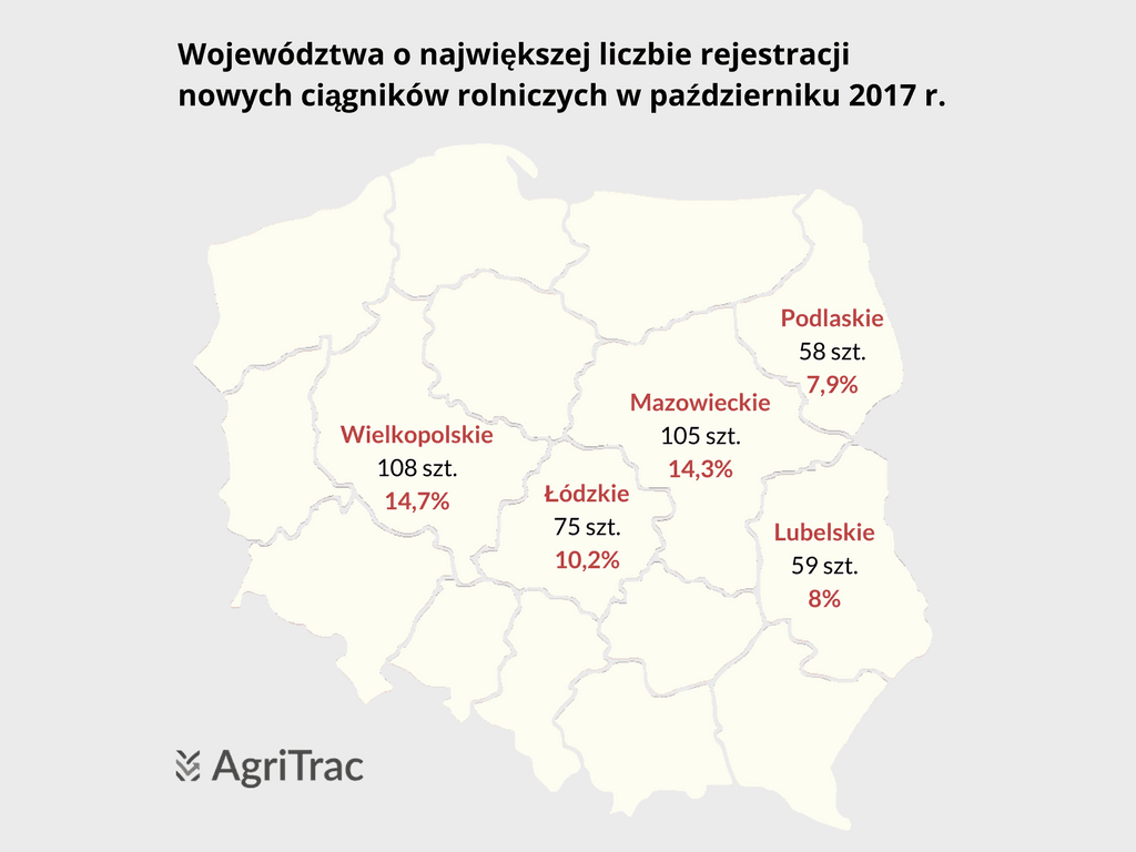 Jeśli chodzi o rejestracje ciągników w październiku – najwięcej nowych maszyn pojawiło się w województwie wielkopolskim. Zarejestrowano tam 108 maszyn – to o 35 szt. (48%) więcej niż w poprzednim miesiącu. Bezsprzecznym liderem jest tu powiat kępiński, na którego terenie można zaobserwować aż 39 nowych traktorów. Dla porównania, we wrześniu były to zaledwie 3 sztuki. Niewiele mniej, bo 105 ciągników, znalazło swoich właścicieli na Mazowszu. 16 z nich trafiło do stolicy. Sporo traktorów pojawiło się także w Łódzkiem. Odnotowano tam sprzedaż 75 maszyn, z których odpowiednio po 9 szt. znalazło swoich właścicieli w powiecie sieradzkim i Łodzi.