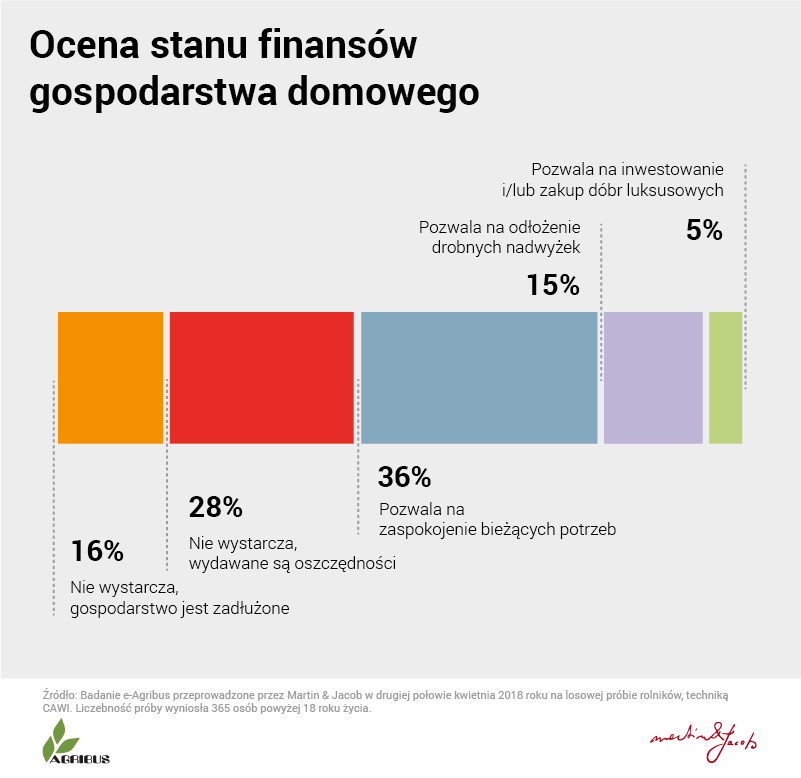 Na zaspokojenie bieżących potrzeb – bez kłopotów, ale też bez rezerw finansowych – może sobie pozwolić 36% ankietowanych. Zadłużonych i żyjących z oszczędności rolników (44%) jest ponad dwukrotnie więcej, niż tych inwestujących z bieżących środków lub odkładających nadwyżki (20%).