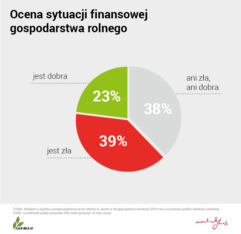 W porównaniu z wynikami z marca tego roku, wzrósł udział skrajnie negatywnych opinii. Najczęściej pojawiają się oceny neutralne (38%). Pozytywną opinię o stanie finansów swojego gospodarstwa rolnego wyraża 23% ankietowanych, a negatywną – 39%. Co piąty rolnik uważa, że czerwiec przyniesie poprawę sytuacji na roli, z obawą w przyszłość patrzy 27% gospodarzy, natomiast 54% ankietowanych uważa, że sytuacja się nie zmieni.