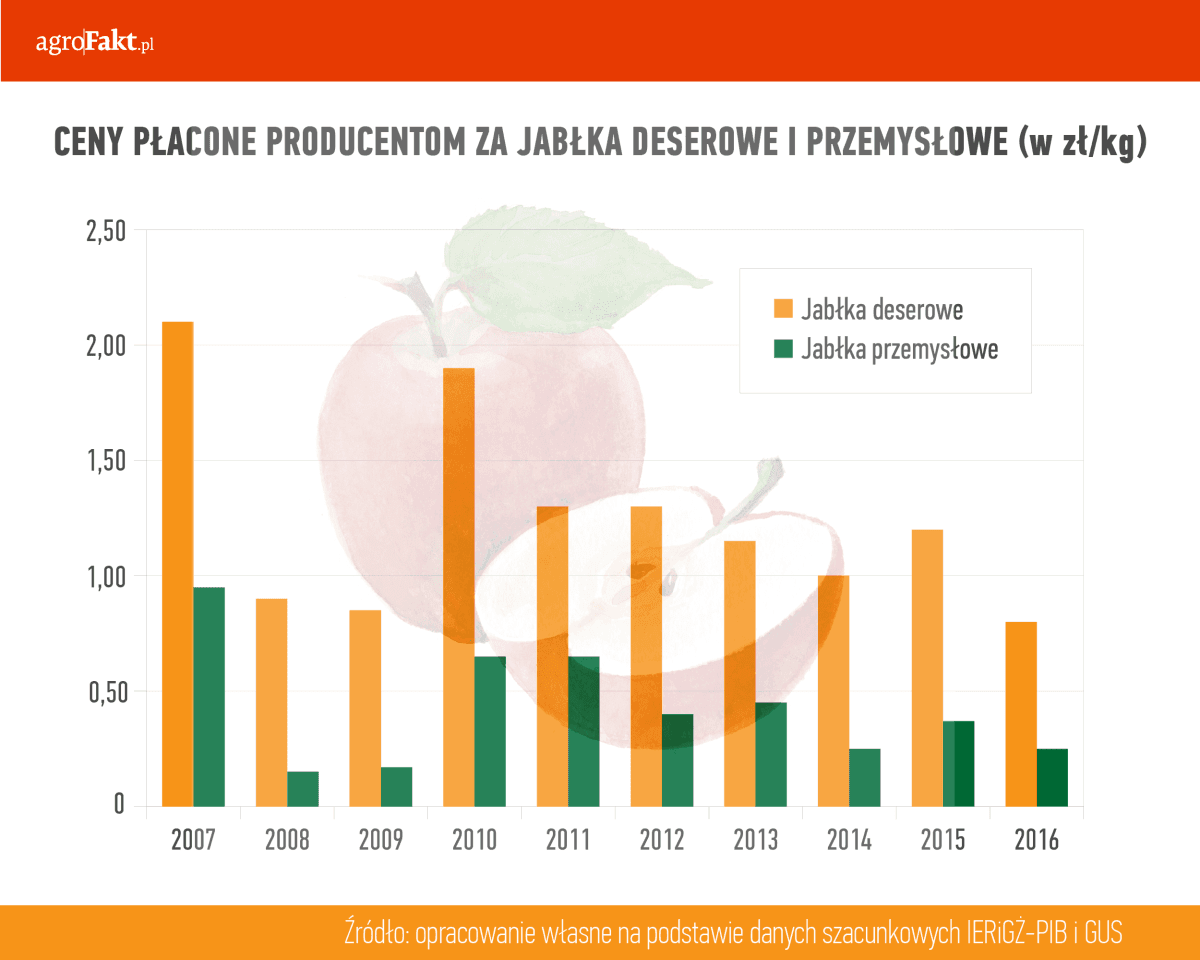 – Bardzo duża podaż jabłek przemysłowych w lecie i jesienią była spowodowana obfitym plonowaniem sadów przydomowych i zaniedbanych oraz sprzedażą do przetwórstwa zapasów jabłek z chłodni, ze zbiorów z 2015 r. – komentuje Smoleński z IERiGŻ.