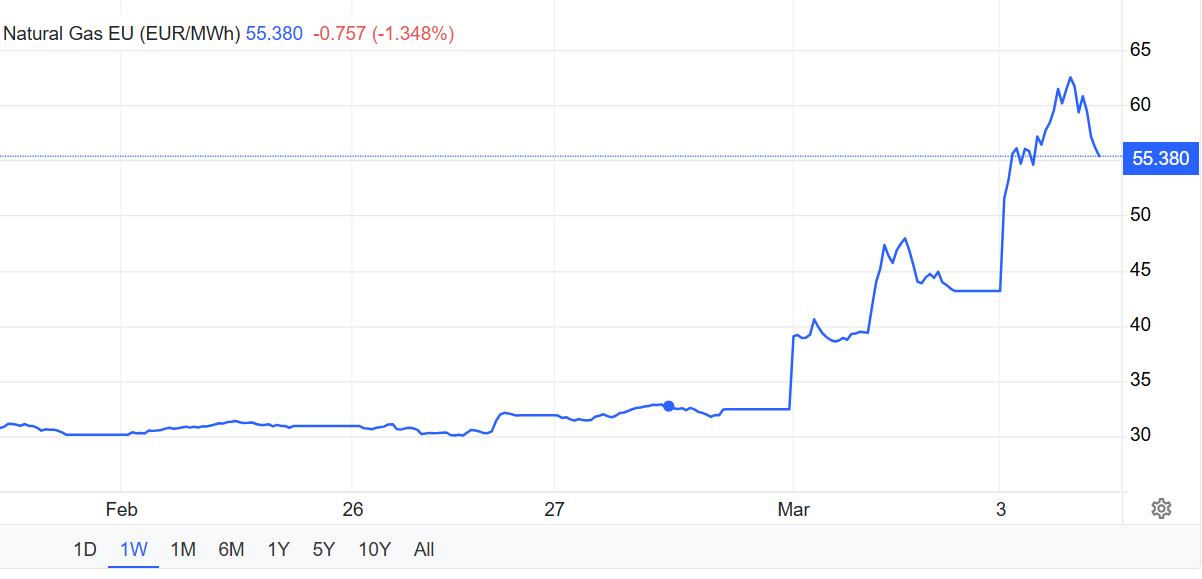 Eskalacja napięć wokół Iranu wywołała reakcję rynków surowcowych. Kontrakty TTF wzrosły 2 marca o 35–50%, a kolejnego dnia o następne 30%. Ropa Brent podrożała o około 8–9%.