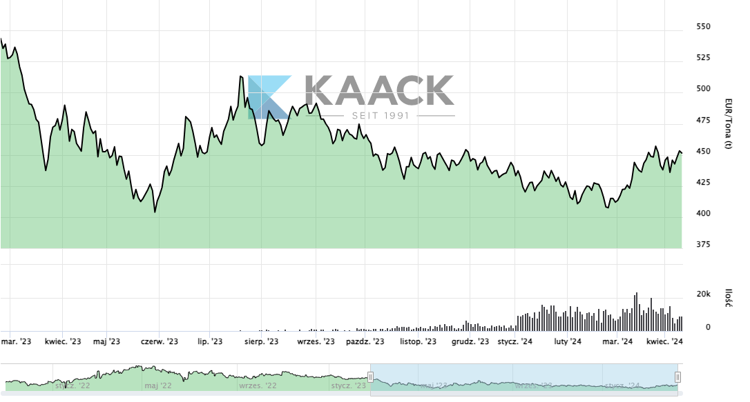 Cena rzepaku na Euronext powróciła do poziomu powyżej 450 euro/t osiągając w czwartek 451 euro/t. Ponadto rzepak na zamknięciu kontraktów terminowych na sierpień 2024 r. osiągnął nowe 6-miesięczne maksimum w nowym sezonie. Wyniosło ono 461 euro/t.