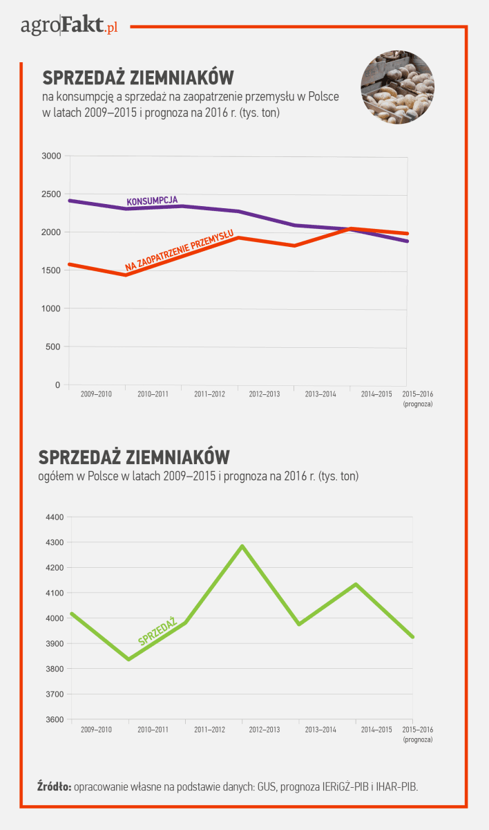 Wydaje się, że krajowy rynek nie jest w stanie wchłonąć nadwyżek produkcji. Maleje konsumpcja ziemniaków. W latach 2009–2015 sprzedaż ziemniaków na cele konsumpcyjne systematycznie spadała. W 2009 r. wyniosła 2,41 mln t. W 2015 r. już 2,05 mln t. W bieżącym roku jest prognozowana na poziomie 1,99 mln t.