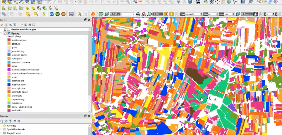 Na starcie SATMIROL zobaczymy, w nawiązaniu do prezentacji Przemysława Slesińskiego z Urzędu Statystycznego w Olsztynie, rozmieszczenie upraw na terenie Polski zgodnie z podziałem administracyjnym, od województwa, poprzez powiaty, gminy, miejscowości (patrz zdjęcie otwierające), na pojedynczej działce kończąc.