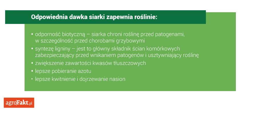 Rzepak jest bardzo mocno narażony na niedobory siarki, która warunkuje prawidłowy wzrost i rozwój roślin. Pierwiastek ten jest bardzo ważnym składnikiem białek, które uczestniczą w licznych procesach fizjologicznych: od metabolizmu węglowodorów, przez fotosyntezę, na budowie glukozynolanów kończąc. Ponadto siarka bierze udział w metabolizmie azotu, przez co jest niezwykle istotna dla rośliny. Siarka i azot kształtują więc przyszły plon, zawartość białek oraz poszczególnych kwasów tłuszczowych w nasionach rzepaku.