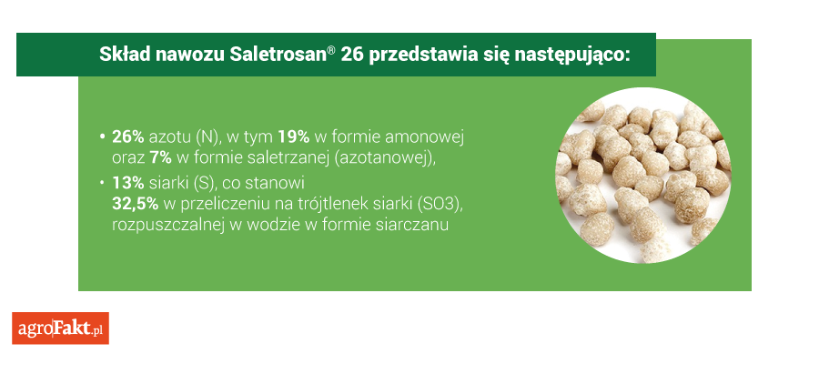 Nawóz Saletrosan® 26 charakteryzuje się też dużą zawartością siarki, która wpływa na wiele procesów metabolicznych w roślinie, a także chroni ją przed patogenami. Siarka w okresie zimowym jest wymywana z gleby, dlatego ważne jest jej uzupełnienie już wiosną, gdy tylko możliwy będzie wjazd na pole. Pamiętajmy, że zgodnie z przepisami nawozy azotowe na gruntach ornych oraz w uprawach wieloletnich można stosować od dnia 1 marca.