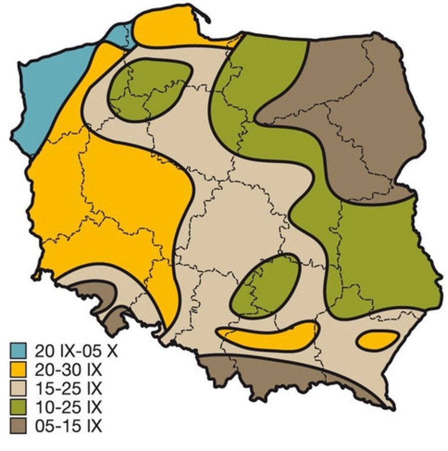 Rys. nr 1. Terminy siewu żyta ozimego w Polsce. Źródło danych Instytut Uprawy Nawożenia i Gleboznawstwa w Puławach