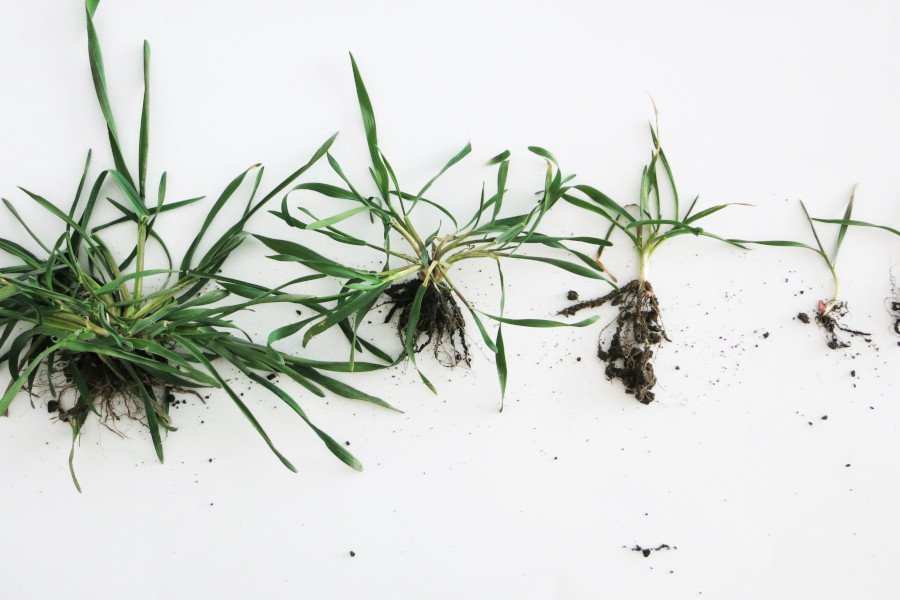 Foto nr 1. Różne stadia rozwojowe roślin żyta ozimego w zależności od zrealizowanego terminu siewu. Zdjęcie wykonane w I dekadzie marca 2021 woj. dolnośląskie. Od lewej roślina z bardzo wczesnego siewu 16.09.2020 – stan niekorzystny; roślina druga od lewej termin siewu 24.09.2020 stan optymalny; roślina trzecia od lewej siew w dniu 12.10.2020 – słabsze rozkrzewienie; ostatnie dwie rośliny termin siewu 28.10.2020 – bardzo niekorzystny stan rozwoju (faza tworzenia liści), widoczna jeszcze nadwrażliwość po zastosowaniu herbicydu.