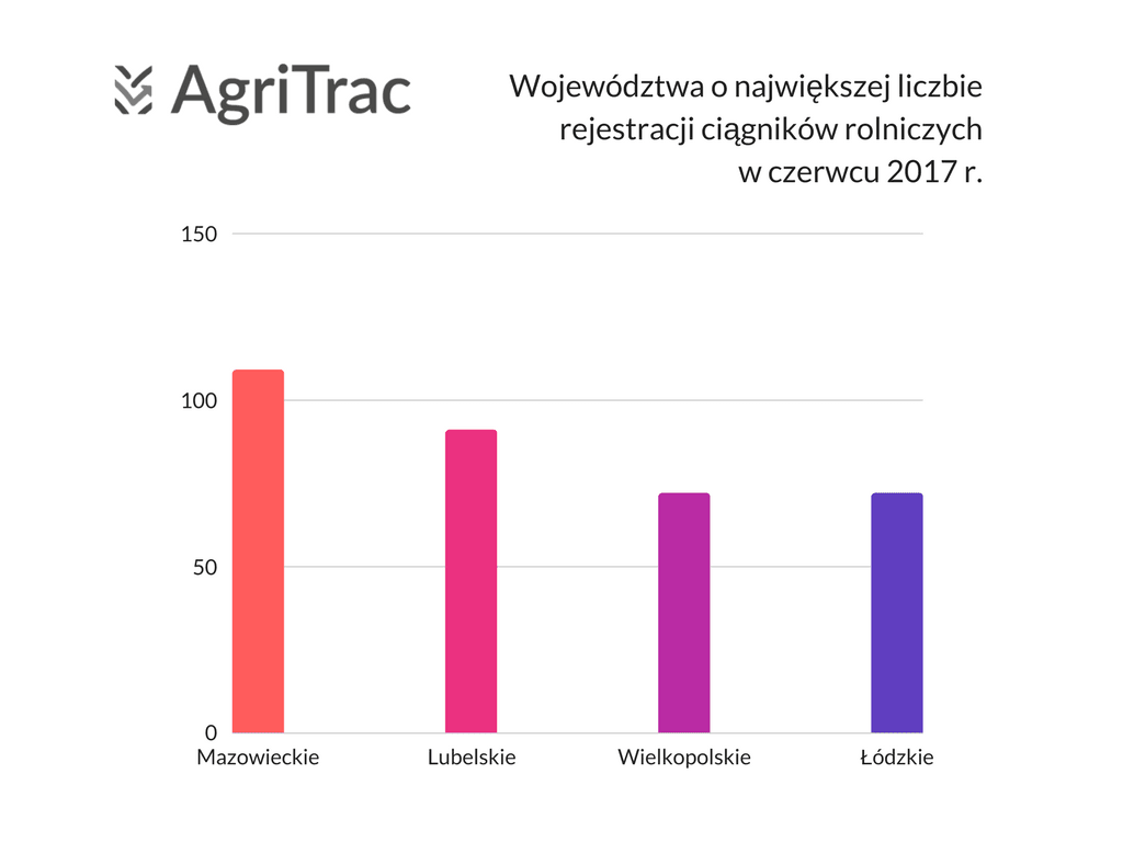 Kolejny miesiąc najwięcej ciągników zarejestrowano w województwie mazowieckim; 109 traktorów otrzymało w czerwcu tablice rejestracyjne w tym regionie. Sprzedaż na takim poziomie oznacza 8-procentowy spadek w porównaniu z majem 2017 r. Sprzedaż ciągników w regionie była jednak o 24% większa niż w czerwcu ubiegłego roku. Drugim regionem pod względem rejestracji było województwo lubelskie; w czerwcu zarejestrowano tam 91 ciągników rolniczych – o 49% więcej niż przed miesiącem. Sprzedaż w regionie była wyższa również w ujęciu rocznym – o 44%. Trzecia lokata przypadła po równo województwom wielkopolskiemu i łódzkiemu; w obu regionach zarejestrowano po 72 ciągniki. Wielkopolska zanotowała więc 1-procentowy wzrost w ujęciu miesięcznym. Przed rokiem sprzedaż ciągników w regionie była jednak wyższa o 20%. Województwo łódzkie odnotowało wzrost 16-procentowy w porównaniu z majem tego roku oraz 38-procentowy w porównaniu z czerwcem 2016 roku.