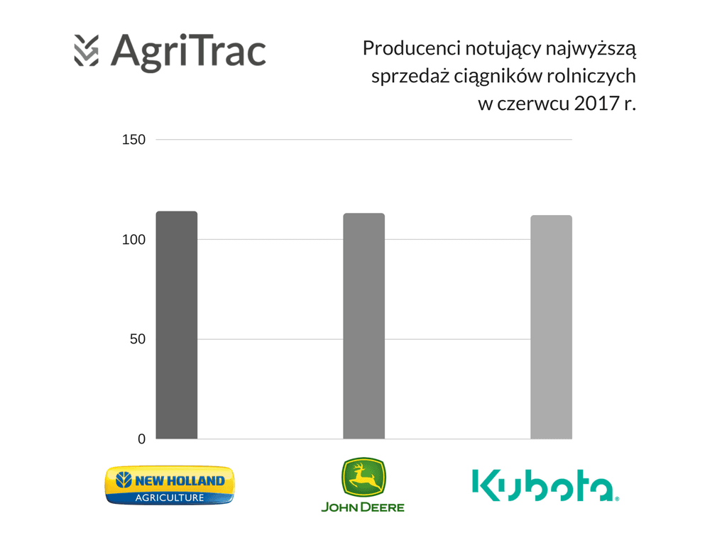 Kolejny miesiąc należał do New Holland – 114 ciągników tej marki znalazło nabywców w czerwcu. Sprzedaż niebiesko-białych ciągników była o 5% niższa niż przed miesiącem; w ujęciu rocznym rejestracja 114 ciągników to 8-procentowy wzrost. Przewaga New Holland topnieje – w czerwcu różnica między liderem a zajmującą kolejne miejsce firmą John Deere wynosiła tylko 1 ciągnik. Producent zielono-żółtych traktorów zamknął czerwiec sprzedażą 113 egzemplarzy. Wynik ten był o 3% lepszy niż przed miesiącem. John Deere odnotował również wzrost sprzedaży w porównaniu do czerwca 2016 roku. W tym ujęciu wzrost wyniósł 5%.