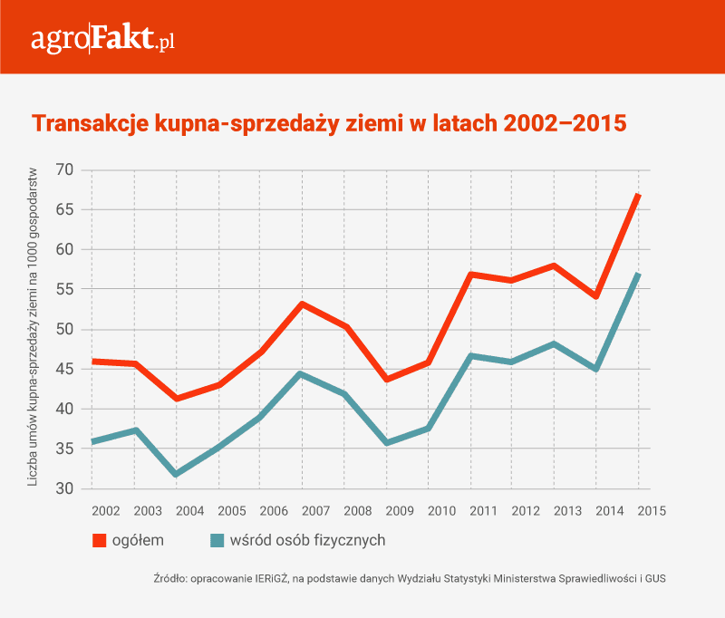 Na tle lat wcześniejszych, rok 2015 cechował się ożywieniem na rynku ziemi rolniczej. W stosunku do 2014 r. liczba transakcji kupna-sprzedaży ziemi wzrosła o 10%, przy czym był to pierwszy tak duży wzrost obrotu od 2011 r.