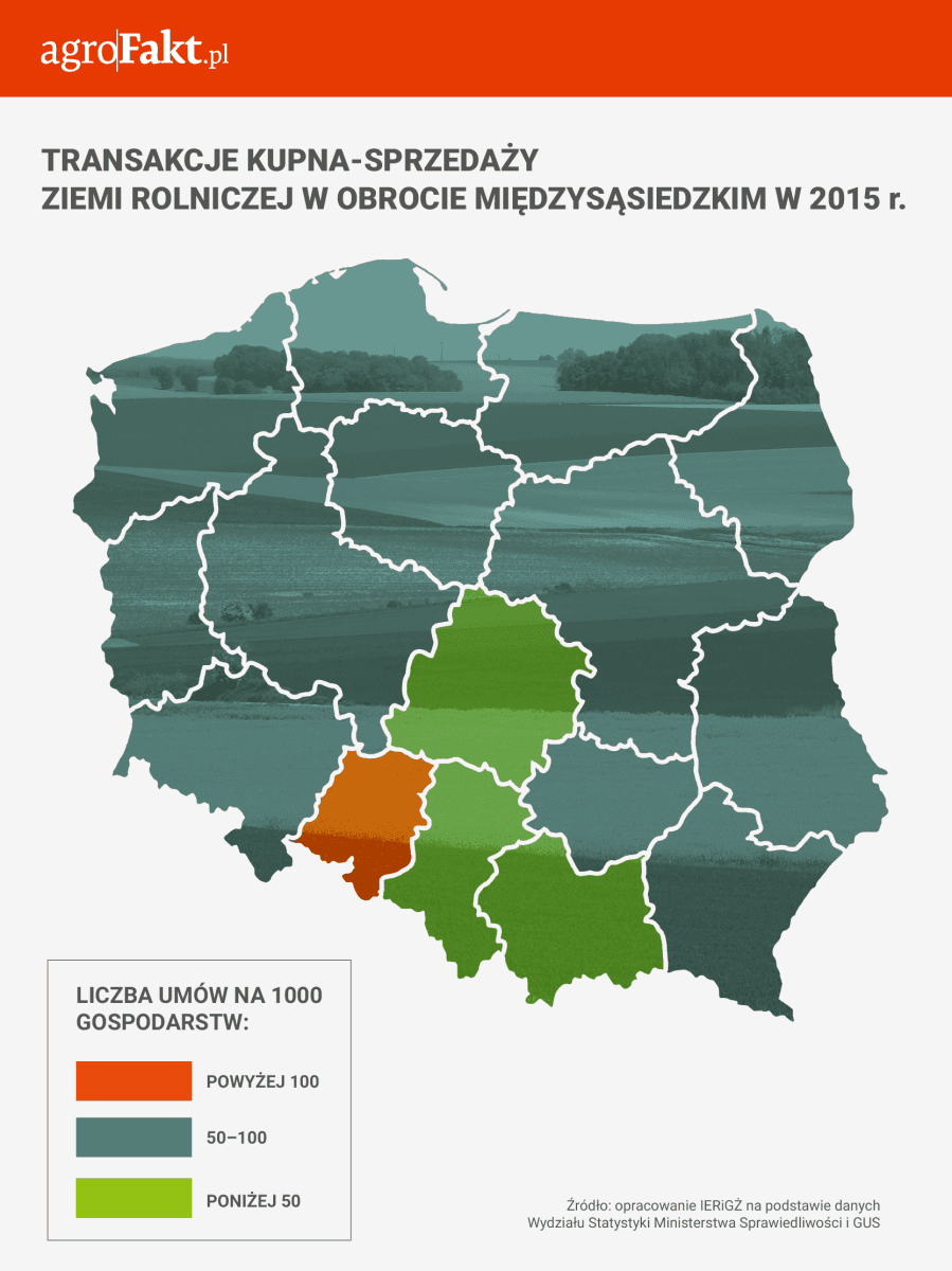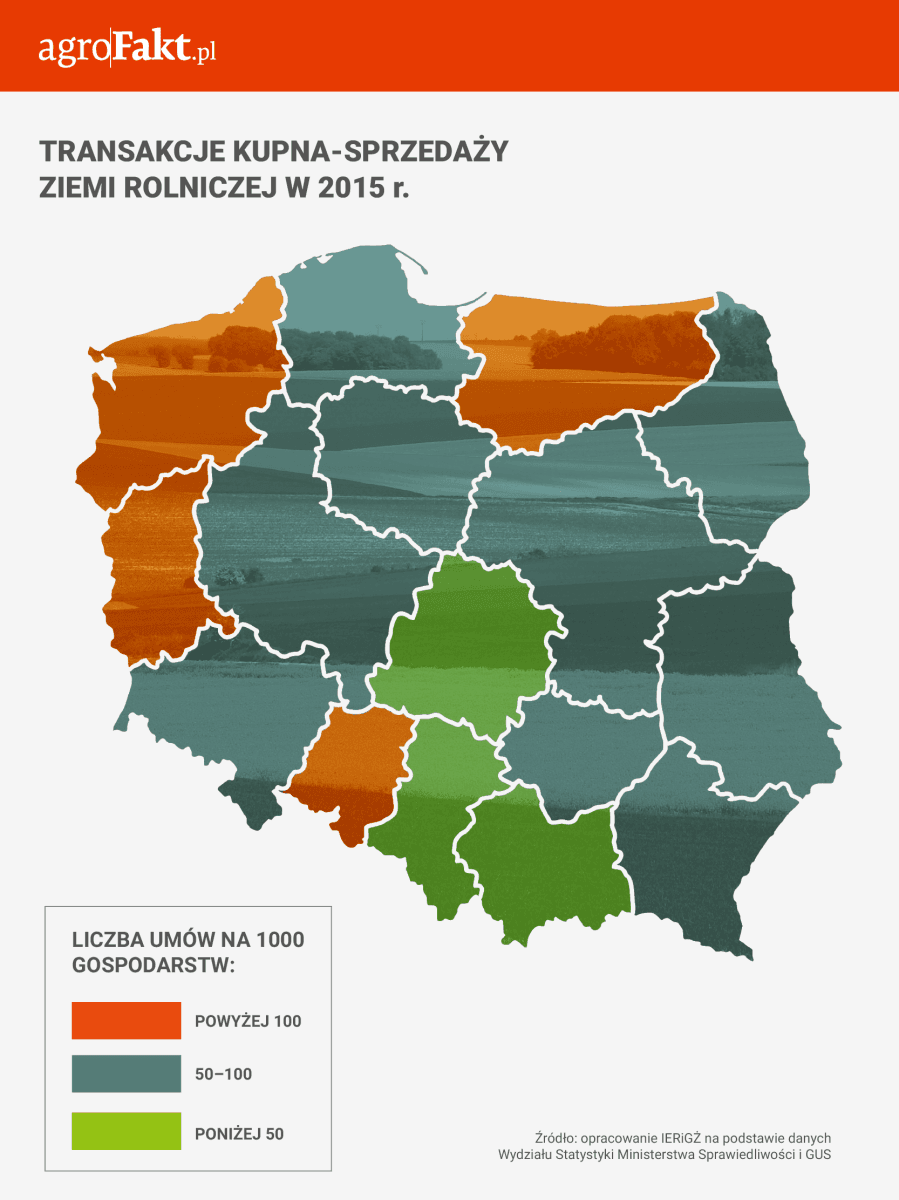 Nasilenie transakcji kupna-sprzedaży ziemi rolniczej w 2015 r. , podobnie jak w latach wcześniejszych, było zróżnicowane terytorialnie. Z badań IERiGŻ wynika, że stosunkowo najwięcej takich transakcji zawarto w województwach północnych i zachodnich. W tym głównie w województwach: zachodniopomorskim, tj. 140 na 1000 gospodarstw, lubuskim – 137 i opolskim –134. Najmniej, tj. poniżej 50 umów na 1000 gospodarstw, odnotowano w województwach: śląskim – 37, łódzkim – 45 i małopolskim – 45.