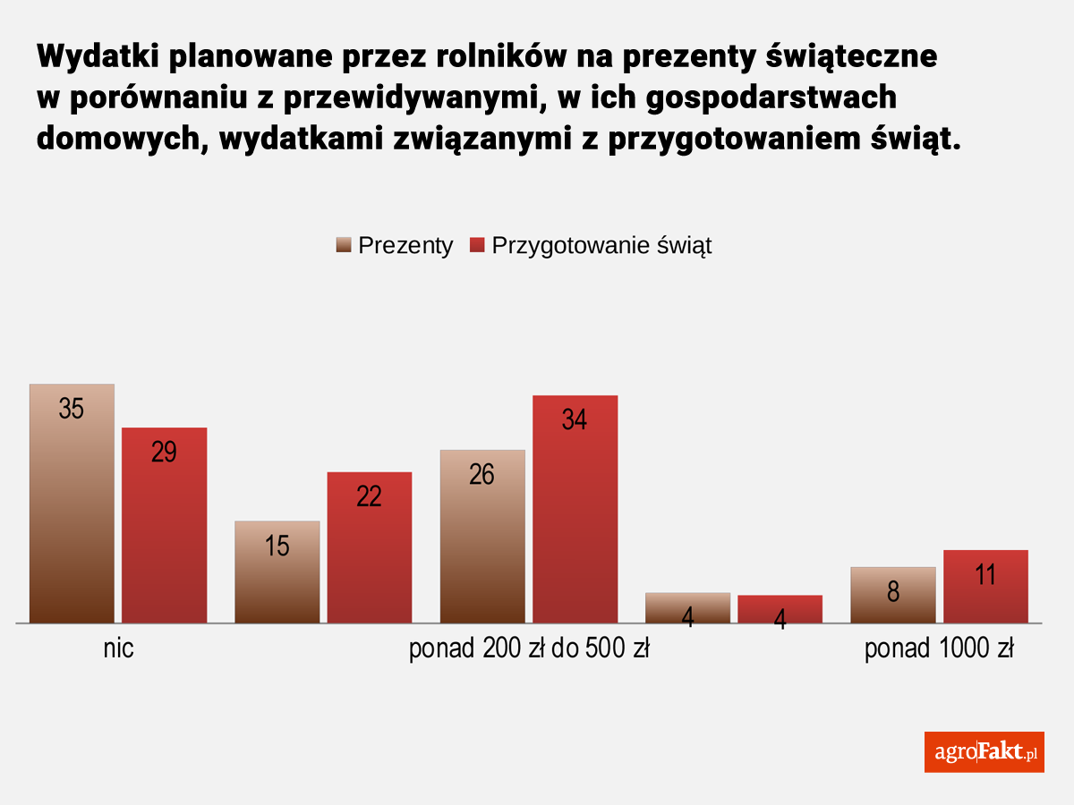 Według badań „Christmas Survey” przeprowadzonych przez firmę doradczą Deloitte, przeciętne gospodarstwo domowe wyda na święta 882 złote. W tej kwocie zawarte są zarówno zakupy spożywcze, jak i ceny prezentów czy świątecznych ozdób. Choć ten rok nie był sprzyjający, rolnicy również wydadzą na święta kwoty podobne lub wyższe niż na poprzednie Boże Narodzenie.